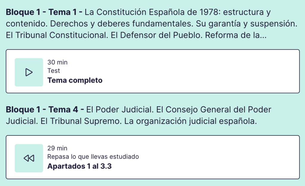 - El segundo tipo de test es igualmente crucial. Después de completar todas las actividades relacionadas con un tema, te enfrentarás a un test del tema completo al día siguiente. Esta estrategia asegura que no solo entiendas cada detalle individualmente, sino que también seas capaz de integrar y aplicar el conocimiento de manera global.
