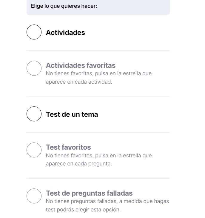 La clave para aprovechar al máximo las actividades temáticas radica en realizarlas antes de sumergirte en el test del tema correspondiente. Estas actividades actúan como una preparación efectiva, preparando tu mente para asimilar la información de manera más sólida y facilitando la recuperación de conocimientos durante el test.