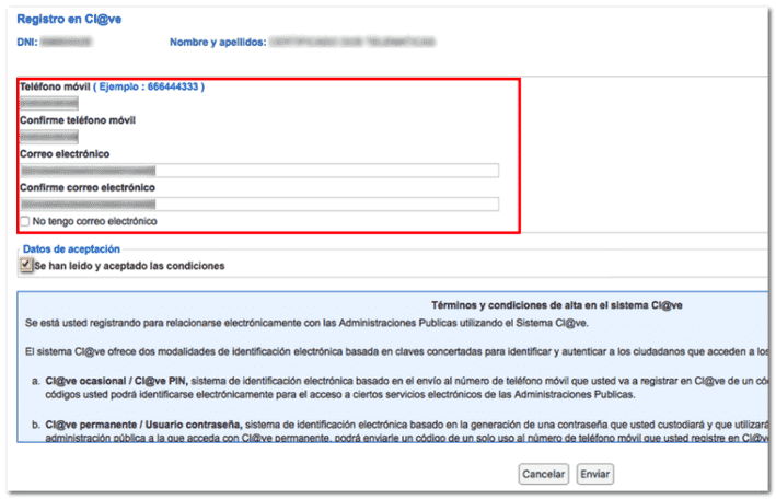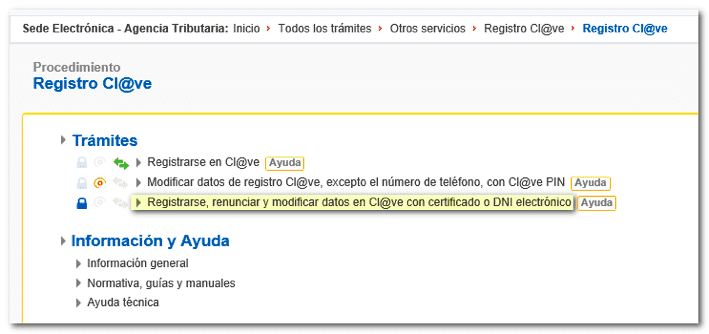A través de la misma dirección, accedemos a la opción “Registrarse, renunciar y modificar datos en Cl@ve con certificado o DNI electrónico”. Después de identificarnos con nuestro certificado lo DNI electrónico, debemos enviar el formulario y seleccionar la opción de "alta" e introducir los datos que nos pide.
