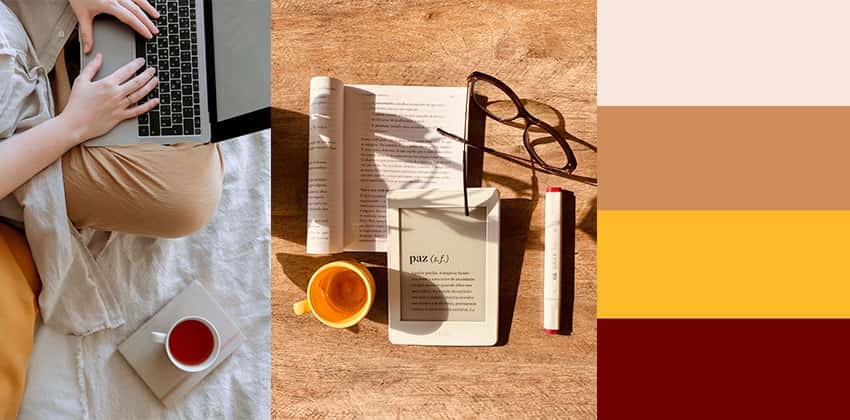 - Colores cálidos. Amarillo, naranja, crema y rojos, son colores que transmiten calidez, alegría y energía. Una apuesta segura y muy efectiva es generar degradados, por ejemplo, desde el amarillo al naranja o al rojo.